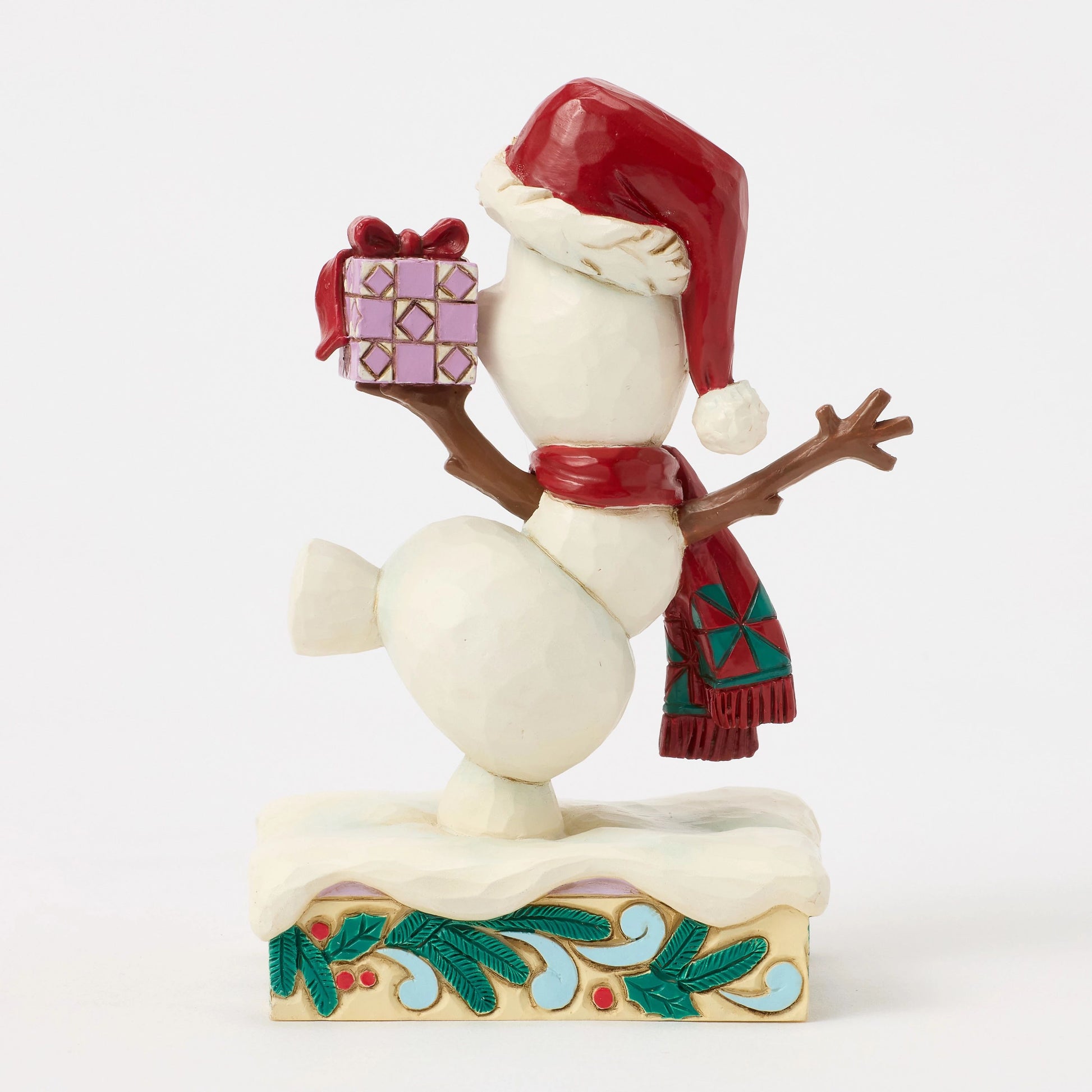 In this joyful Jim Shore design, Olaf dances merrily in the snow with a wide smile, donning a Santa hat and a festive scarf while carrying a colorful present. Adorned with charming rosemaling details, this delightful piece captures holiday cheer.