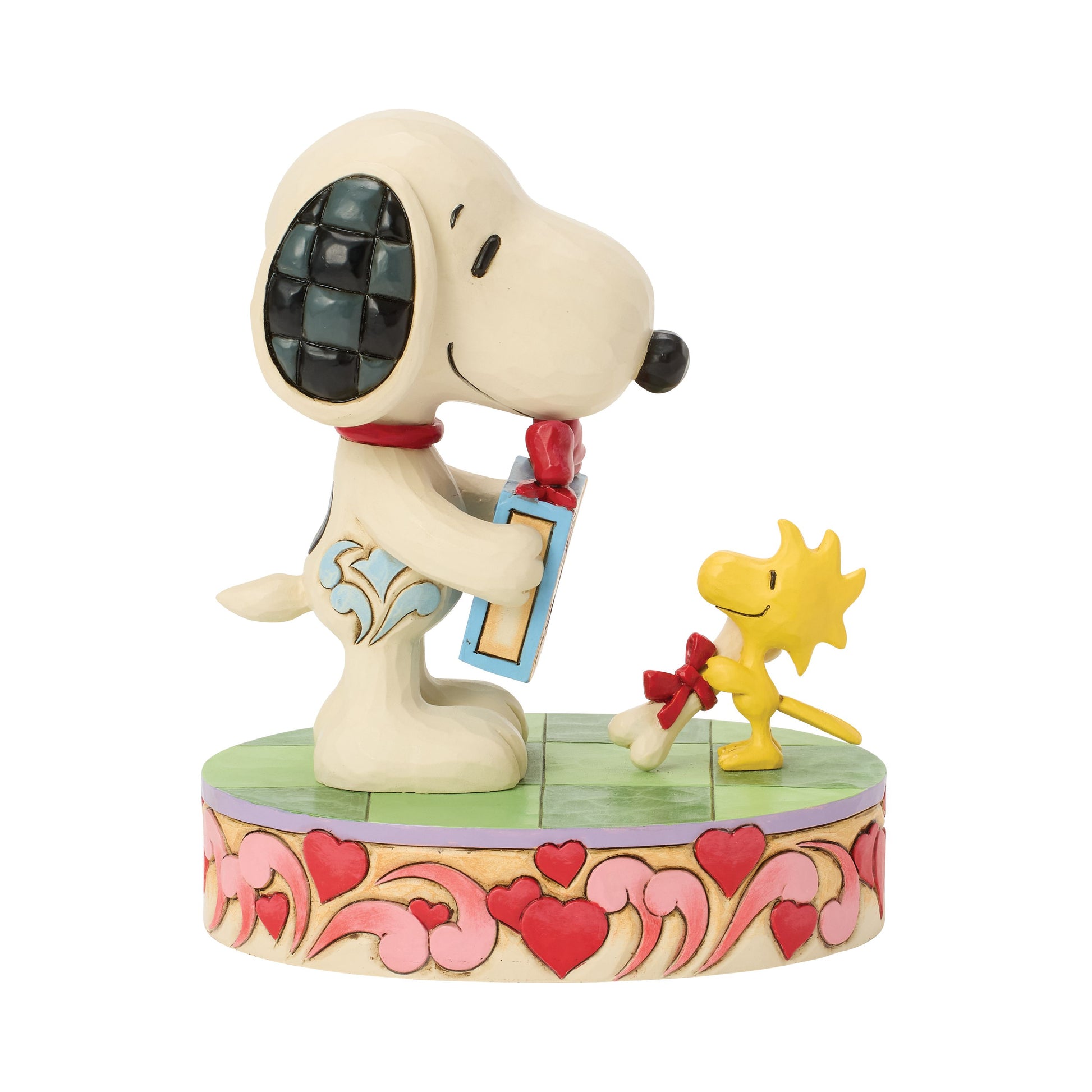 Snoopy and Woodstock share a heartfelt moment of friendship and love in this charming Jim Shore Valentine's Day design. Decorated with hearts and Jim Shore's signature folk-art details, Snoopy gifts Woodstock birdseed and gets a bone in return.